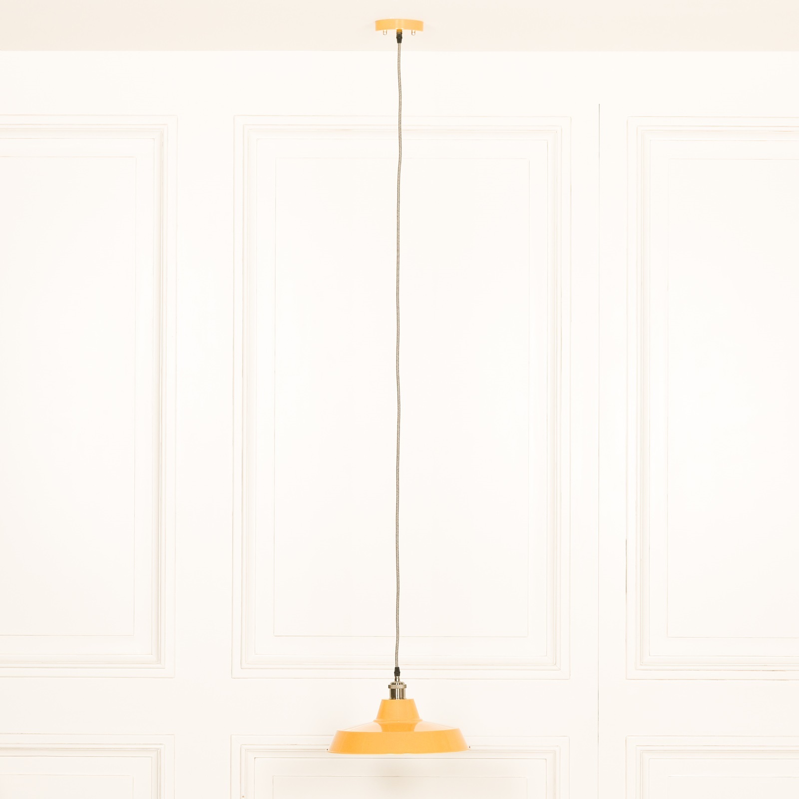 A replica of an enamel pendant that’s been used in barns and factories across Europe throughout mid 20th century. Yellow Painted Pendant will illuminate your kitchen or dining space. This ceiling light presents the practical design, functional fixtures and braided cord, and we gave it a new look in four finishes.